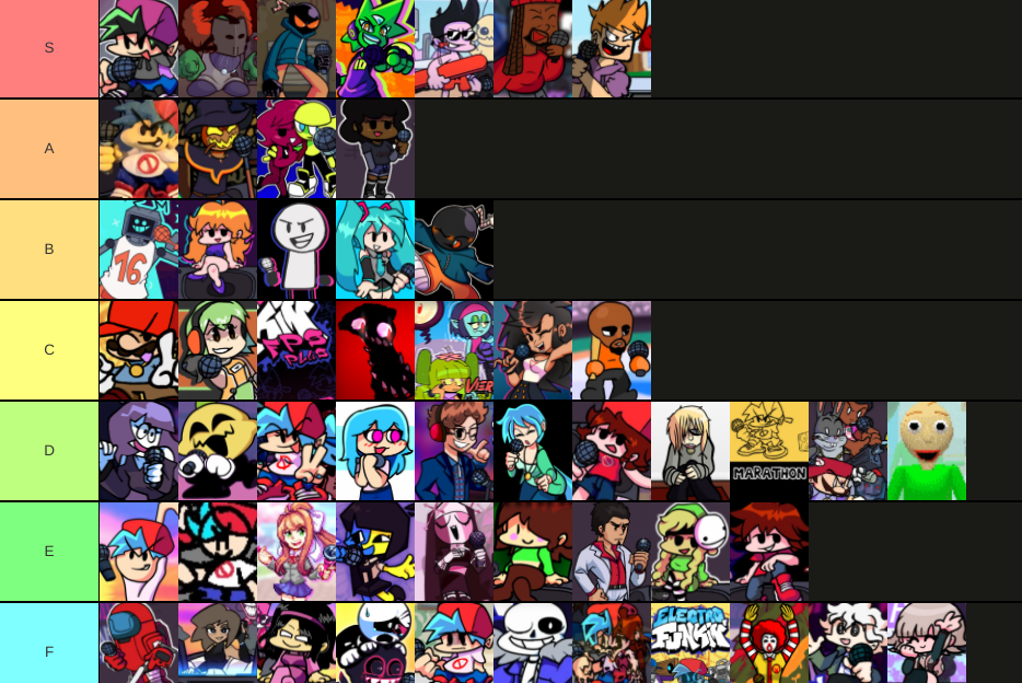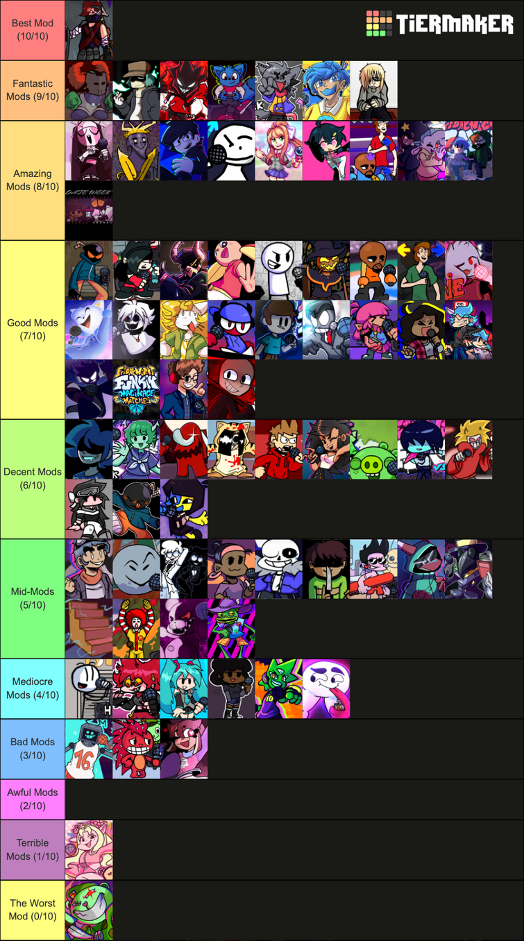 Friday Night Funkin. Drag the images into the order you would like. If your favorite mod isnt here then i either dont know it or dont care about it Fuckin funkin wkoi wasnt on the tier list but its an S tier mod.